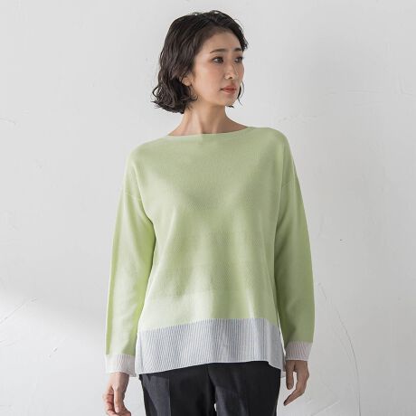 袖口と裾にシアー素材の配色編地切替を施すことでレイヤード風のこなれ感が1枚で完成します。