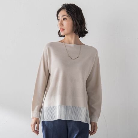 袖口と裾にシアー素材の配色編地切替を施すことでレイヤード風のこなれ感が1枚で完成します。