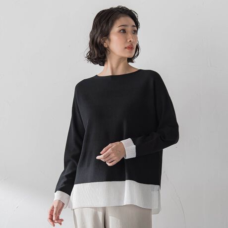 袖口と裾にシアー素材の配色編地切替を施すことでレイヤード風のこなれ感が1枚で完成します。