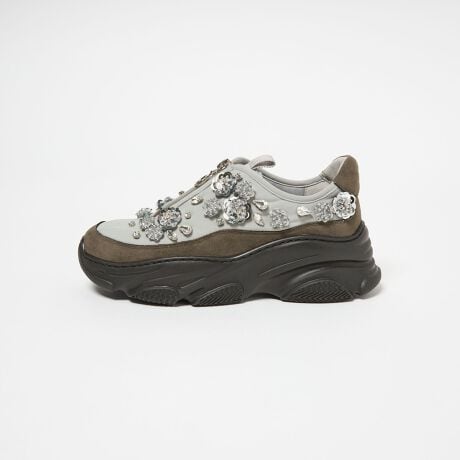 アッパーにスパンコールでつくったフラワーモチーフとさまざまな形や大きさのビジューを縫い付けたスニーカー。