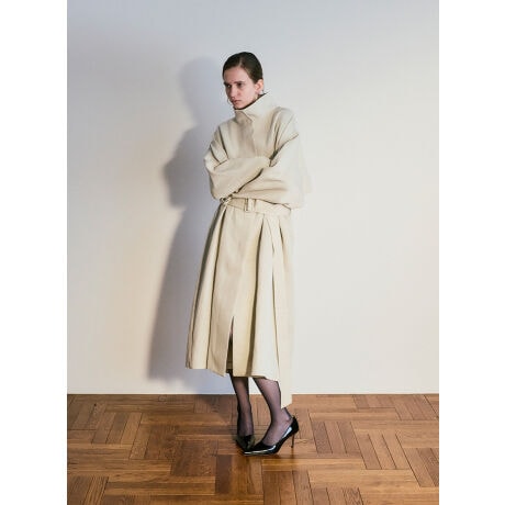 ウールxリネン素材。リネンのフシがナチュラルな印象で、サテンに近いツイル目の程よい光沢感とドレープ感がある素材。
