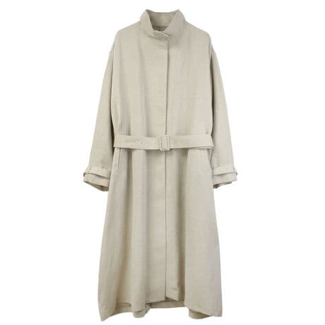 ウールxリネン素材。リネンのフシがナチュラルな印象で、サテンに近いツイル目の程よい光沢感とドレープ感がある素材。
