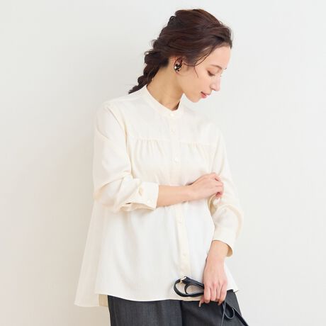 胸元の切り替えにギャザーが入り、ややフレアのあるシルエット。シンプルで合わせやすいデザインに仕立てています。