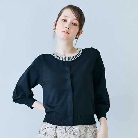 ・キラキラと繊細な輝きを放つ、ビジューを襟ぐりに施した華やかなカーディガン。