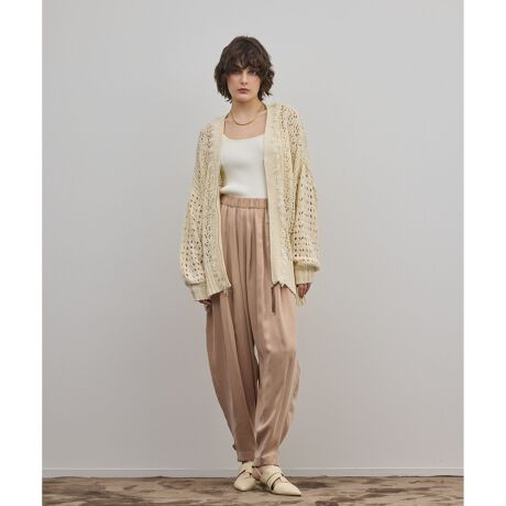 [型番:0126153119]表面感のあるテープヤーンを使用した透かし編み柄のミドル丈ニットカーディガン。※こちらのモデル着用画像はサンプル品を撮影しております。実際の商品と仕様、加工、サイズが若干異なる場合がございます。予めご了承くださいませ。