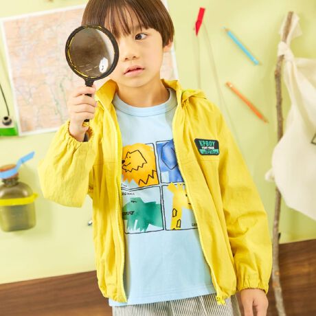 表地にナチュラルなシワ感が特徴のやわらかいナイロンタッサー素材を使用したウィンドブレーカー。裏地も、メッシュ素材で肌にベタ付かず、軽やかな着心地です。フードは、ファスナーで取り外しが可能。UVカット効果、撥水効果のある表地なので、デイリーから、ちょっとした外遊びのシーンでも活躍しそう。後ろ身に付けたアウトドアテイストのワッペンづかいも、アクティブな雰囲気を印象づけます。裾は、ドローコード付きで、フィット感の調整が可能。