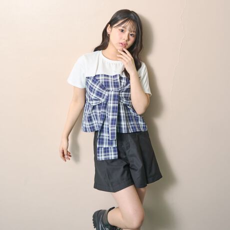 チェック柄のベアトップを重ね着しているような、女の子らしいデザイン。