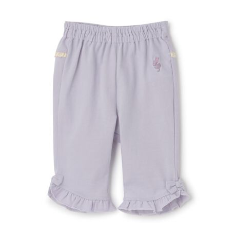 ストレッチの利いたデニム調のニットツイルを使用した6分丈パンツです。ベーシックなデザインながら、裾のフリルと、後ろ身頃にはさみ込んだゴムレースが、可愛らしい仕様。裾の両脇には、共地のリボンも付いています。ウェスト総ゴム仕様で穿きやすく、またトップスを選ばず、着回ししやすい1枚。色違いで揃てみても。