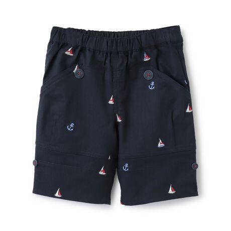 ストレッチ性のある生地にヨット刺しゅうをほどこしたマリンテイストのハーフパンツです。裾は折り上げてもはけるボタンつきの仕様で、アレンジを楽しめる可愛らしいデザイン。ウエストのアジャスターゴムでサイズ調節できるのもうれしいポイントです。シンプルなTシャツを合わせると、さわやかなコーディネートが完成します。内側にお名前を記入できるタグつき。刺しゅうの裏に「あて布」はございません。【おすすめの着用時期は春夏シーズン】