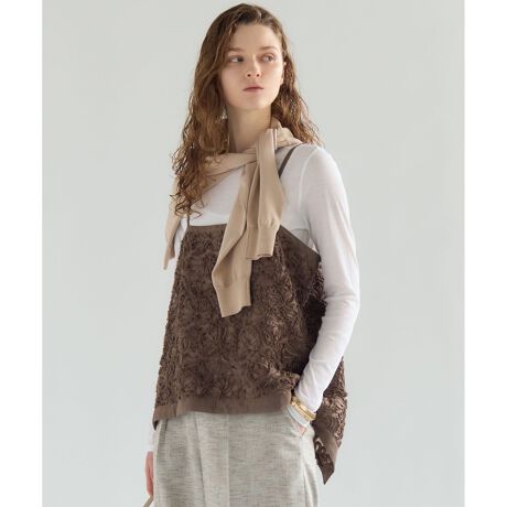 23区オリジナルの刺繍柄が目を引く、存在感のあるキャミソールです。透け感のあるポリエステル生地を細いテープ状にカットし、フリルのように立体的に刺繍した、他にはない華やかなデザインが魅力です。肩紐はボタンとホールで長さの調整が可能ですので、中に合わせるインナーや、お好みのバランスに合わせて着こなしをお楽しみいただけます。シンプルなシャツやブラウス、カットソーの上に重ねるだけで、いつものコーディネートが華やかにアップデートされます。デニムと合わせてカジュアルダウンしたり、きれいめパンツやスカートと合わせてオフィススタイルやお食事会など、幅広いシーンで上品な着こなしをお楽しみいただけます。カラーは、シックで上品な印象のブラック(#005)、落ち着いた大人の雰囲気を醸し出すブラウン(#030)、そして柔らかな印象を与えるベージュ(#033)の3色をご用意いたしました。