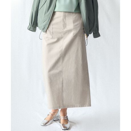 ワークテイストなディテールを取り入れた、すっきりとしたIラインシルエットのスカートです。大きめのポケットから続くようにデザインされたベルトループが特徴的で、トップスをインしてベルトを通すスタイリングも様になります。後ろにはスリットが入っているため、タイトなシルエットながらも足さばきが良く、動きやすさも兼ね備えています。カットソーをインしてカジュアルに着こなしたり、ニットカーディガンを羽織ってリラックス感のあるスタイルに仕上げたりと、オンオフ問わず活躍する一枚です。カラーは、こなれ感のあるカーキ(#054)、着回し力抜群のベージュ(#133)、知的な印象を与えるネイビー(#175)の3色展開です。
