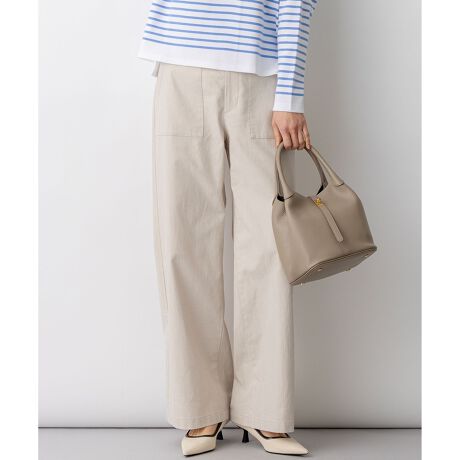 ■デザイン人気のベイカーパンツを、より快適で美しいバランスにアップデートしました。腰回りに少しゆとりを持たせることで、リラックスした穿き心地を実現しつつ、ワイドストレートのシルエットがすっきりとした印象を与えます。ヒップから裾にかけて程よいボリューム感があり、着回し力抜群。フロントのステッチ入りポケットがアクセントになり、トップスをインしたスタイルもメリハリよく決まります。季節を問わない素材感で、Tシャツやニットベストと合わせたカジュアルスタイルから、シャツやブラウスを合わせたきれいめな着こなしまで幅広く活躍します。カラーは、清潔感のあるホワイト(#001)、こなれた印象のカーキ(#054)、爽やかなアクセントになるブルー(#070)、ナチュラルで合わせやすいベージュ(#133)、シックで落ち着いたネイビー(#175)の5色展開です。