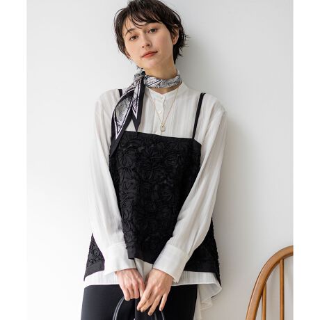 23区オリジナルの刺繍柄が目を引く、存在感のあるキャミソールです。透け感のあるポリエステル生地を細いテープ状にカットし、フリルのように立体的に刺繍した、他にはない華やかなデザインが魅力です。肩紐はボタンとホールで長さの調整が可能ですので、中に合わせるインナーや、お好みのバランスに合わせて着こなしをお楽しみいただけます。シンプルなシャツやブラウス、カットソーの上に重ねるだけで、いつものコーディネートが華やかにアップデートされます。デニムと合わせてカジュアルダウンしたり、きれいめパンツやスカートと合わせてオフィススタイルやお食事会など、幅広いシーンで上品な着こなしをお楽しみいただけます。カラーは、シックで上品な印象のブラック(#005)、落ち着いた大人の雰囲気を醸し出すブラウン(#030)、そして柔らかな印象を与えるベージュ(#033)の3色をご用意いたしました。