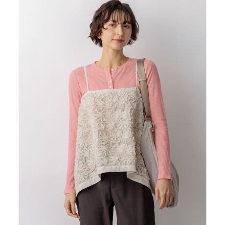 23区オリジナルの刺繍柄が目を引く、存在感のあるキャミソールです。透け感のあるポリエステル生地を細いテープ状にカットし、フリルのように立体的に刺繍した、他にはない華やかなデザインが魅力です。肩紐はボタンとホールで長さの調整が可能ですので、中に合わせるインナーや、お好みのバランスに合わせて着こなしをお楽しみいただけます。シンプルなシャツやブラウス、カットソーの上に重ねるだけで、いつものコーディネートが華やかにアップデートされます。デニムと合わせてカジュアルダウンしたり、きれいめパンツやスカートと合わせてオフィススタイルやお食事会など、幅広いシーンで上品な着こなしをお楽しみいただけます。カラーは、シックで上品な印象のブラック(#005)、落ち着いた大人の雰囲気を醸し出すブラウン(#030)、そして柔らかな印象を与えるベージュ(#033)の3色をご用意いたしました。