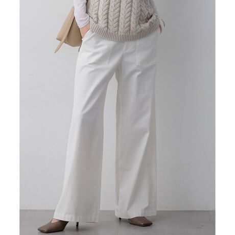 ■デザイン人気のベイカーパンツを、より快適で美しいバランスにアップデートしました。腰回りに少しゆとりを持たせることで、リラックスした穿き心地を実現しつつ、ワイドストレートのシルエットがすっきりとした印象を与えます。ヒップから裾にかけて程よいボリューム感があり、着回し力抜群。フロントのステッチ入りポケットがアクセントになり、トップスをインしたスタイルもメリハリよく決まります。季節を問わない素材感で、Tシャツやニットベストと合わせたカジュアルスタイルから、シャツやブラウスを合わせたきれいめな着こなしまで幅広く活躍します。カラーは、清潔感のあるホワイト(#001)、こなれた印象のカーキ(#054)、爽やかなアクセントになるブルー(#070)、ナチュラルで合わせやすいベージュ(#133)、シックで落ち着いたネイビー(#175)の5色展開です。