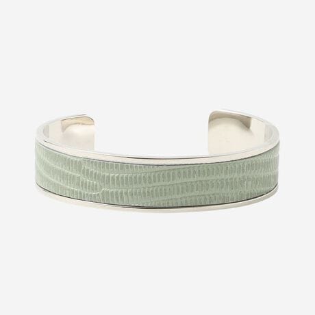 [型番:G5V01726__]艶の美しいリザード型押レザーのバングルです。上品で軽やかなオフホワイト、ベージュ、セラドンの3色展開です。手首が見えるコーディネートのワンポイントになります。ニッケルフリーのメッキを施しています。お揃いの革のバッグ(G5107721)、ベルト(G5302702 03オフホワイト、40ベージュ、70グリーン)も展開しております。