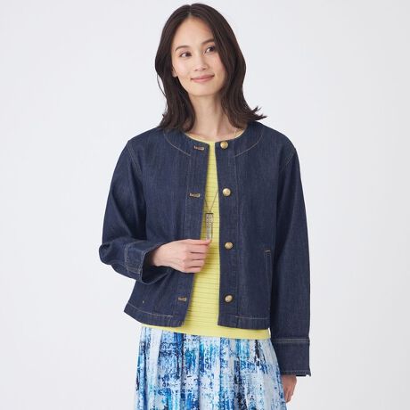 トレンド感のあるメタルボタンがアクセントです。箱ポケットやリターンできる袖口スリットのように綺麗めのディティールです。ワンウォッシュ加工のインディゴネイビーと、バイオブリーチ加工で色を落としたブルーの2色展開です。