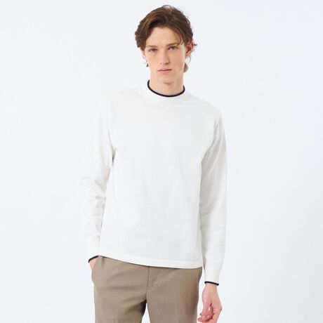 衿先と袖口に配色でラインを入れたセミモックネックニットです。衿のラインがスポーティさとクリーンな印象を演出します。