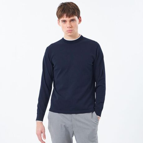 衿先と袖口に配色でラインを入れたセミモックネックニットです。衿のラインがスポーティさとクリーンな印象を演出します。