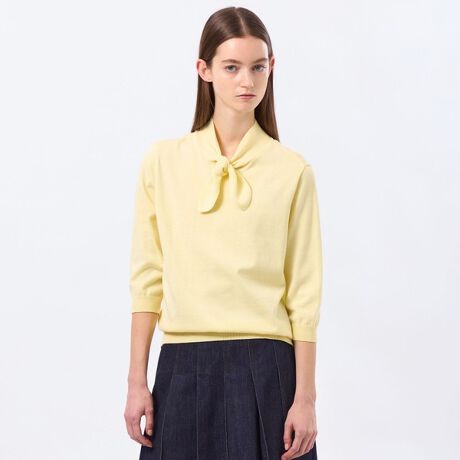 顔周りに華やかさをもたらしてくれるリボンタイニット。