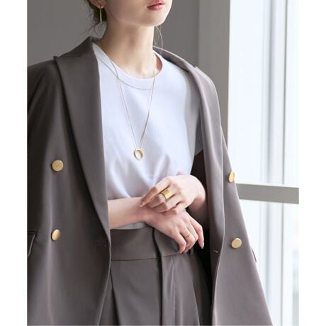 肩幅は通常よりも小さく設定し、女性らしい印象に。ネックを詰まりすぎないようにやや広めに調整し、シンプルながら旬なルックスに仕上げています。