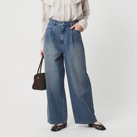 フロントのタックやポケットディテールに、スラックスの要素を取り入れたワイドシルエットデニム。