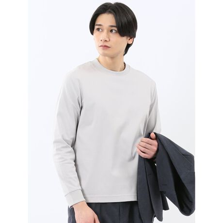 ジャケットの衿が汚れにくい、後ろ衿巾を高くしたスロープネックの長袖Tシャツです。衿・袖口のリブ切り替えと裾部分の表地切り替えがポイント。綺麗目なインナーアイテムとしてジャケットインに最適な一枚です。プライベートからオフィスカジュアルまでオンオフ兼用で着回しが可能です。
