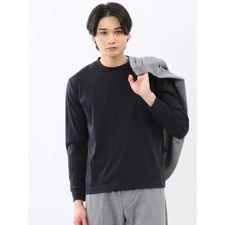 ジャケットの衿が汚れにくい、後ろ衿巾を高くしたスロープネックの長袖Tシャツです。衿・袖口のリブ切り替えと裾部分の表地切り替えがポイント。綺麗目なインナーアイテムとしてジャケットインに最適な一枚です。プライベートからオフィスカジュアルまでオンオフ兼用で着回しが可能です。