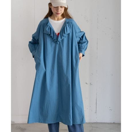 フロントのフリルデザインがキャッチーなワンピース。羽織を合わせてもポイントになります。ボタンを外してスキッパーネックで着用しても抜け感が◎。両サイドにポケット付き。