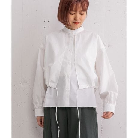 ふんわりとしたギャザースリーブに、ベスト風のレイヤーが重なる立体的なデザインのシャツブラウス。ベスト部分の紐を軽く絞って気分やスタイルに合わせてフォルムの変化を楽しめます。羽織としても着用いただけます。