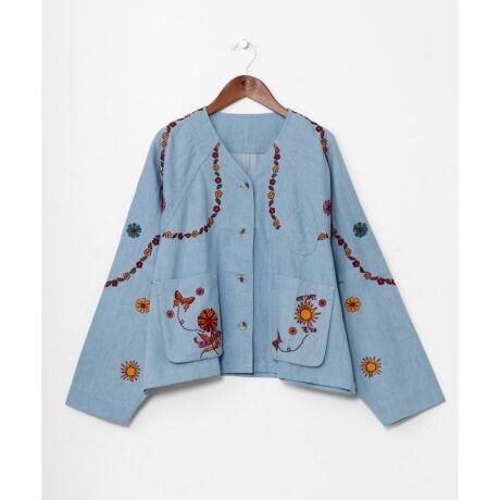[型番:ISA-6104-2026]花の刺しゅうが目を惹く薄手デニムシャツ。ノーカラーとマチ付きポケットのディテールで仕立てたオーバーサイズシルエット。ヒッピーの思想をデザインに込めた一着。