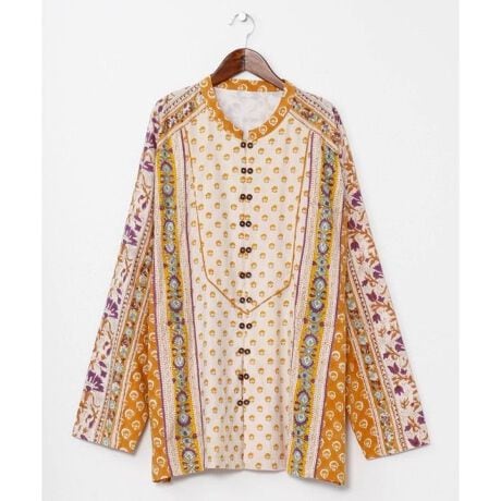 [型番:ILL-6108-2026]ヨーロッパのロマ民族をイメージしたブロックプリントシャツ。シルバー調ボタンがアクセントとなり、前開きは2つに1つがフェイク仕様で着脱もスムーズ。軽やかな綿素材で、着心地がよい一枚。