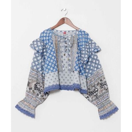 [型番:ILL-6110-2026]ブロックプリントを活かしたバルーンフリル袖と、ベストを重ねたようなデザインが特徴のトップス。一枚で立体感あるスタイルが完成する、個性的な一枚。