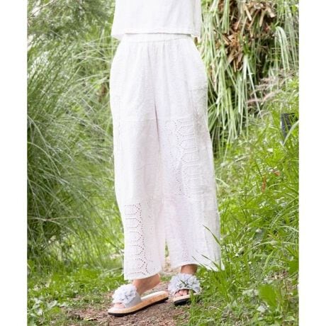 3種の刺しゅう生地とレース、ドビー織をパッチワークしたストレートパンツ。前裾スリット入りで抜け感あり。色柄豊富でコーデの主役にぴったりな一本。