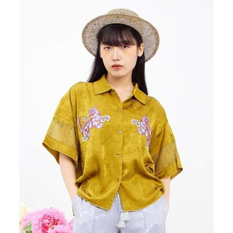 [型番:COT-6115-2026]サテンジャカードと虎の刺しゅうが存在感を放つ開襟シャツ。袖のレースが妖艶さを加え、ゆったりシルエットでオリエンタルな雰囲気が漂う一枚。