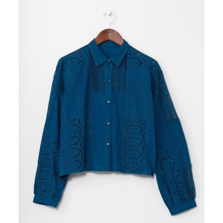 [型番:IDS-6112-2026]3種の刺しゅう・レース・ドビー織を使用した贅沢なパッチワークシャツ。短丈デザインで通気性も抜群。鮮やかなカラーが映える、唯一無二の存在感ある一枚。
