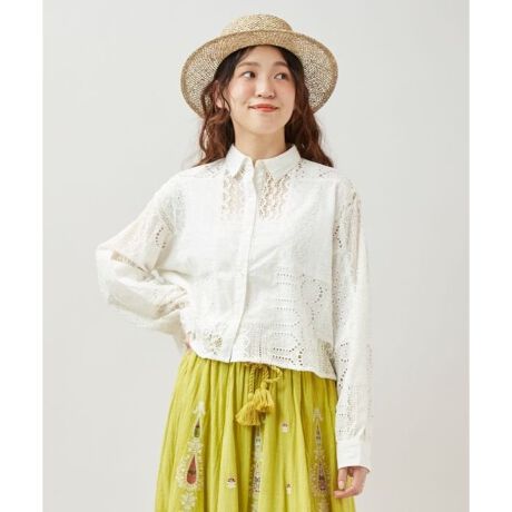 [型番:IDS-6112-2026]3種の刺しゅう・レース・ドビー織を使用した贅沢なパッチワークシャツ。短丈デザインで通気性も抜群。鮮やかなカラーが映える、唯一無二の存在感ある一枚。