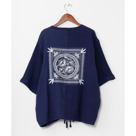 [型番:IDS-6104-2026]藍色デニムに4種の異素材を組み合わせたパッチワークメンズトップス。後ろには中国の「ミャオ族」のろうけつ染風プリント。裾紐でシルエット調整可能。