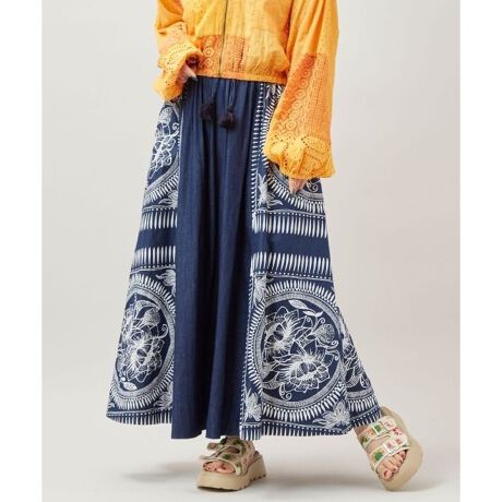 [型番:IDS-6133-2026]サイドの柄が目を惹くデニムスカート。中国の「ミャオ族」の伝統工芸ろうけつ染をイメージしたプリント。インディゴ染めの深みと広がるシルエットで、個性派コーデに最適。