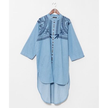 [型番:IDS-6110-2026]藍染ジャケットを彷彿とさせるロングシャツ。中国の「ミャオ族」の伝統工芸ろうけつ染をイメージしたプリント。インディゴ染めの深みと広がるシルエット。民族衣装の魅力をモダンに表現。