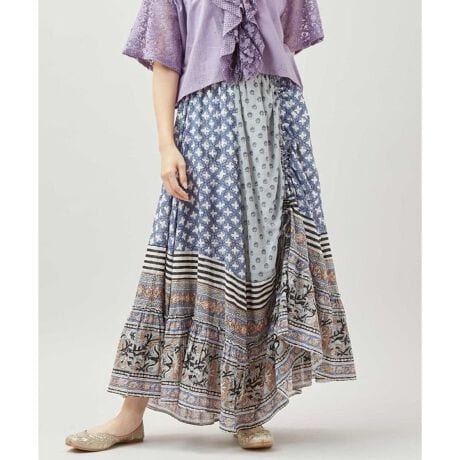 [型番:ILL-6111-2026]華やかなブロックプリントとたっぷりのフレアシルエットが魅力のスカート。左前のドローストリングでアレンジも楽しめるデザイン。エスニックな個性が光る一着。