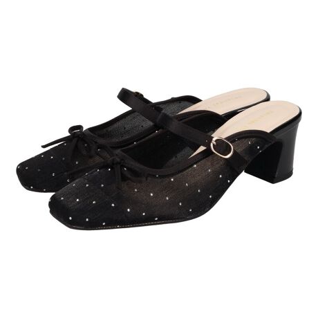 ラインストーンをあしらったチュール素材にリボンデザインを掛け合わせたフェミニンな要素満載のミュールパンプス。つま先を程よいスクエアトゥにすることで甘くなりすぎず大人の女性にも合わせやすいアイテムに仕上げました。やわらかいアッパー素材と甲部分のストラップでホールド感も高く足にフィットし、更に太めのヒールで歩きやすいデザイン性と履きやすさを兼ね備えた1足。サンプルにて撮影をしておりますので、中敷色、ロゴ色、裏地の色の仕様に変更がある場合がございます。あらかじめご了承ください。