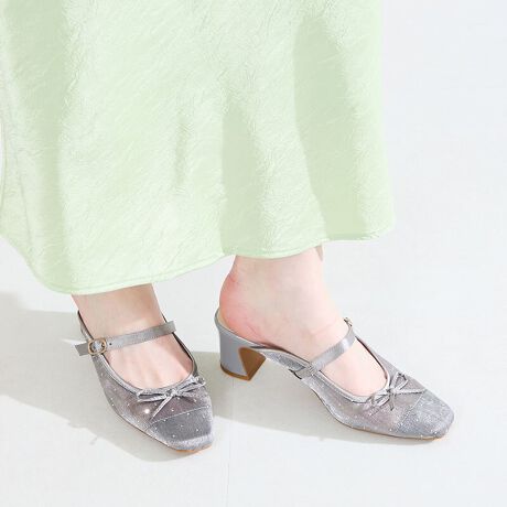 ラインストーンをあしらったチュール素材にリボンデザインを掛け合わせたフェミニンな要素満載のミュールパンプス。