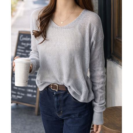 Vネックラインがデコルテをきれいに見せ、女性らしさをさりげなくプラス。