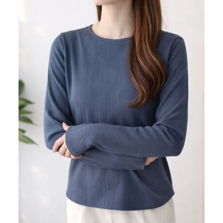 ラウンドネックは開きすぎず、首元をすっきり見せてくれます。