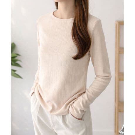 身体のラインにやさしく沿うシルエットで、着るだけで自然な細見えを演出します。