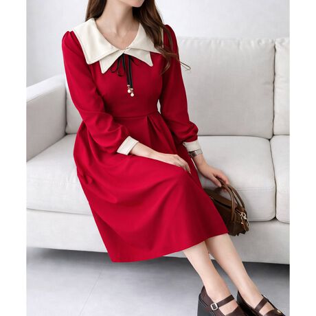 配色のセーラーカラーが目を引く、上品でクラシカルな印象のワンピースです。