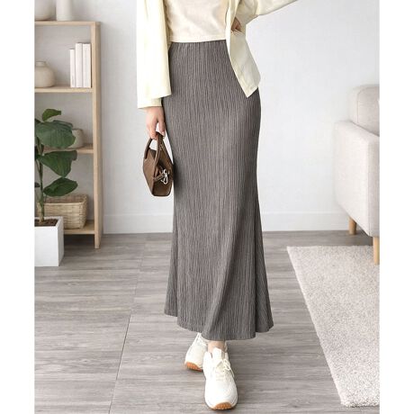 縦ラインを強調するシワ加工プリーツが、すっきりとした印象を与えるロングスカートです。