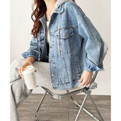 デニム風の素材感に取り外し可能なフードを組み合わせた、こなれ感のあるデザイン◎