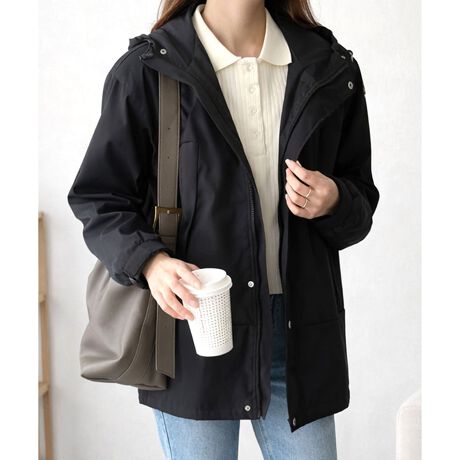 シンプルなデザインにフードをプラスし、ほどよくラフで今っぽい印象に。